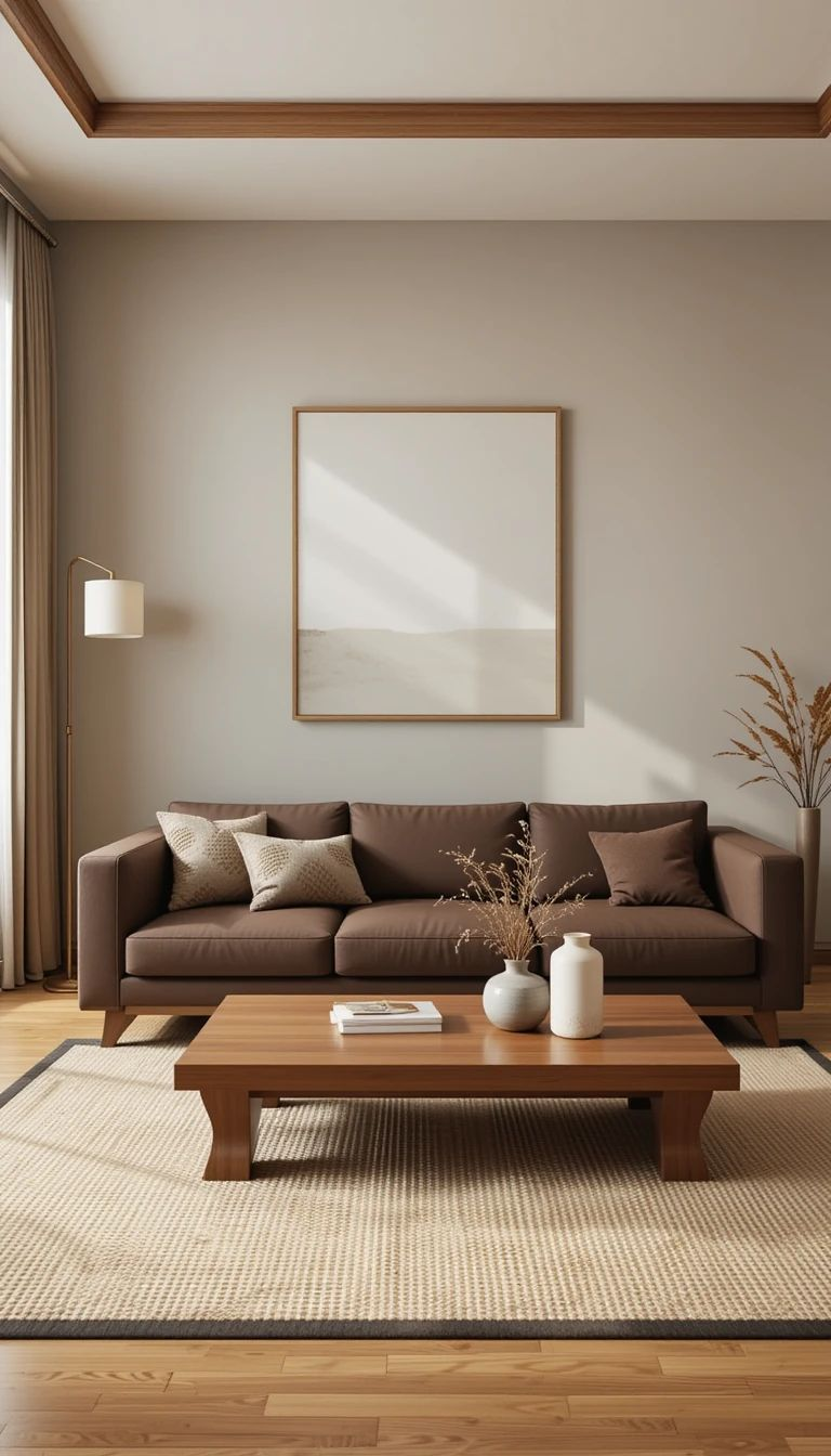 – Add framed art, mirrors, or wall panels – Neutral or earthy artwork complements brown tones – Makes the sofa area the focal point